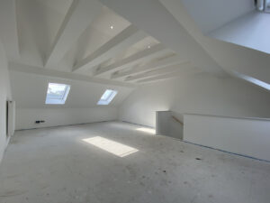 Über eine offene Holztreppe gelangt man in das erste Obergeschoss, hier befinden sich drei gut geschnittene Zimmer, als Schlaf-, Kinder- oder Arbeitszimmer zu nutzen und ein modernes Duschbad mit begehbarer Rainshower – Dusche und Fenster. Im ausgebauten Dachgeschoss wurde ein lichtdurchflutetes Atelier mit freiliegenden Balken und eingelassenen Punktstrahlern geschaffen.